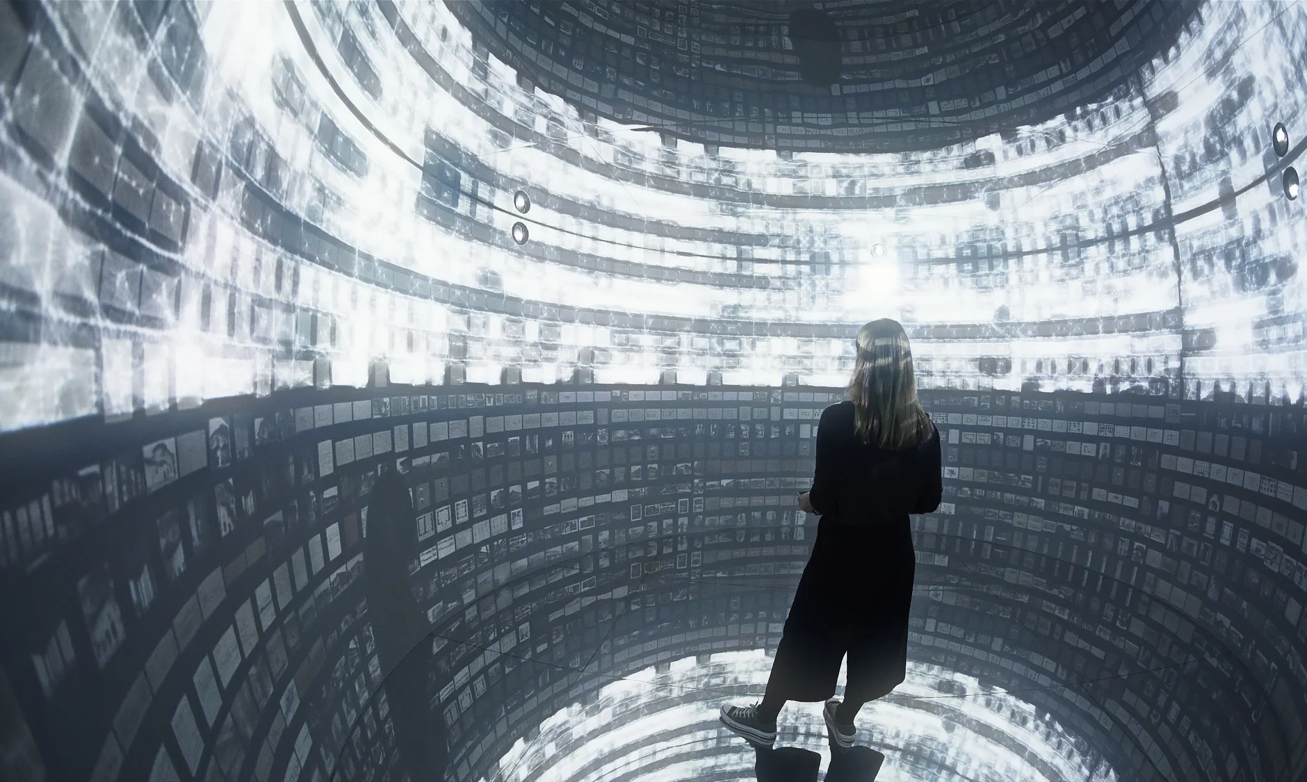 “Once trained, the generator can be used to generate new images based on the same statistical rules, creating documents that never existed but look similar to true ones, documents that perhaps could have existed in another version of history. The final result is a temporary immersive architectural space created as a canvas with light and data applied as materials.”
