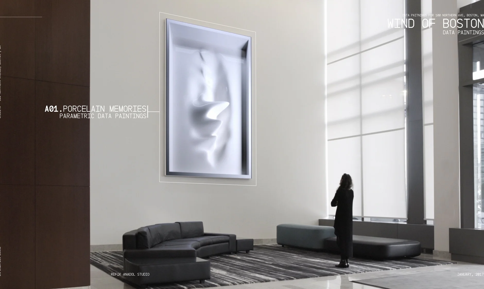 This piece isn’t Anadol’s only one replacing pigment on canvas with light and data on a screen. Rather, the artist sees data as an incredible material with which to paint seducing compositions that appear to have lives of their own. His piece, Wind of Boston, is an ever-evolving work with a foundation in data about Boston’s wind patterns. Similar to Archive Dreaming’s organic display of concrete information, this work presents viewers with the artist’s interpretation of a data set from Boston’s Logan Airport. After building custom software to analyze the data, he created an oscillating and fluid piece, displayed on an LED screen in a lobby in Boston.