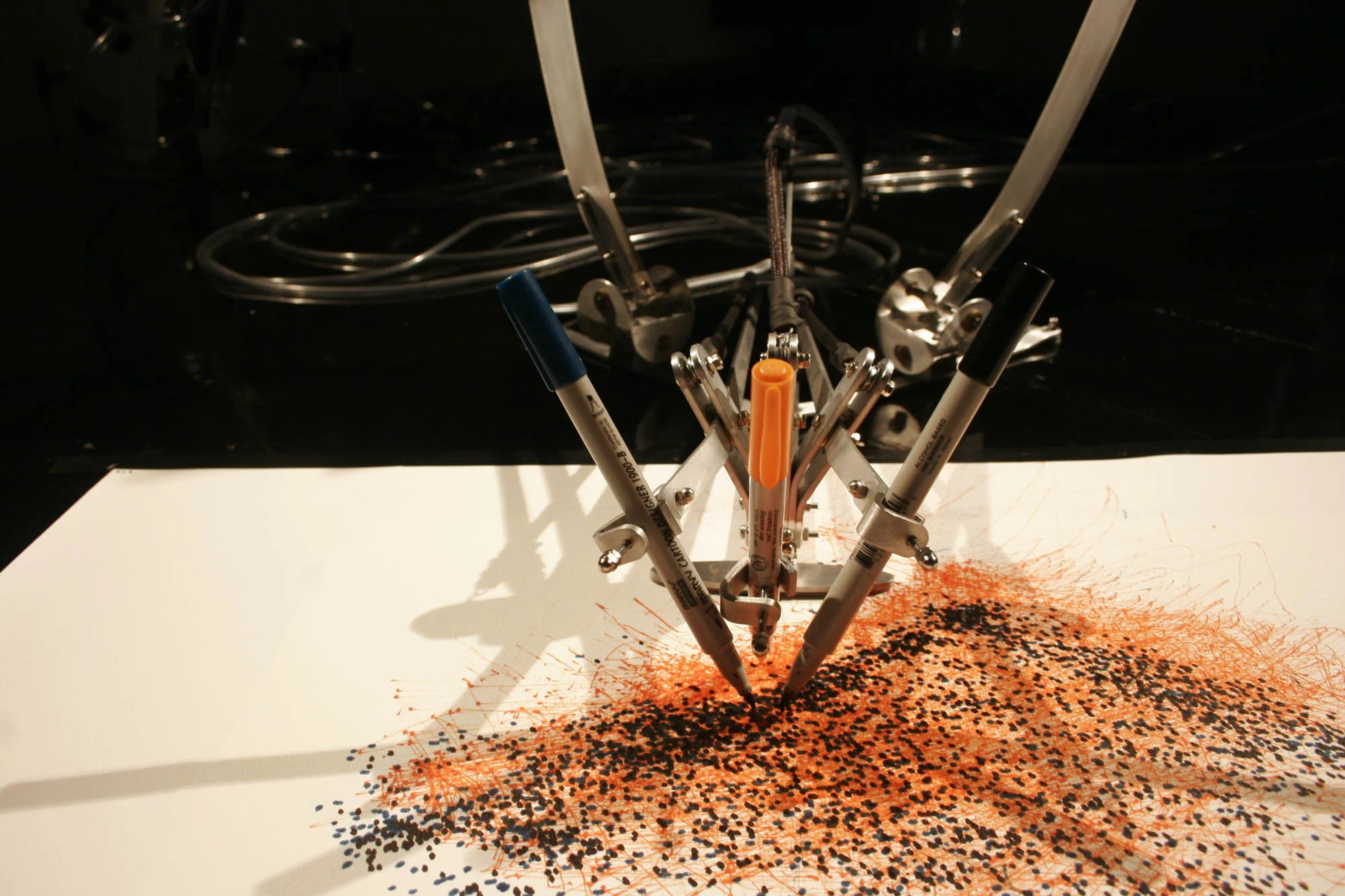 "MEART- The Semi Living Artist" was created by a group of scientists and artists through SymbioticA. This research lab based in the University of Western Australia strives to identify and bring to life new scientific platforms and subjects for artists to experiment with. SymbioticA provides a way for artists to collaborate with scientists in research projects to develop new biological, ecological, bioethical, neuroscientific, and engineering technologies. MEART is one of these research projects that explores the relationship between living nerve cells and robotics. The cultured nerve cells grow in the neuro-engineering lab at the Georgia institute of Technology. These cells, which act as a brain, send information to the robotic arm that produces two-dimensional drawings. The data captured by a camera observing the surrounding environment of the installation is sent to the lab housing these living nerve cells. Depending on what is happening in the environment, the nerve cells will send information to the robotic arm to influence composition of the drawings. Although these two elements of the project are not geographical in the same location, they are still able to communicate in real time through the internet. However, once the nerve cells die, the robotic arm "dies" as well.