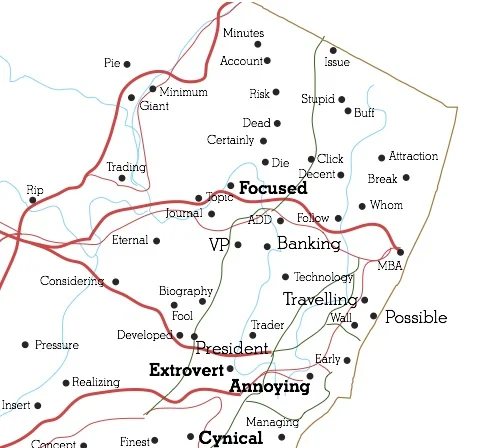 DuBois’s work often deals with data constructs. He creates algorithmic and generative art to describe himself and others. In 2011, he created another generative work about modern romance called A More Perfect Union. In this work, he made a census of the United States based on online dating sites. The artist joined 21 different online dating sites as a straight man, straight woman, gay man, and gay woman. He then downloaded hundreds of thousands of online profiles. He plugged those profiles into an algorithm he created and found the most common word used in these profiles for each city of the country. All words are unique to each individual city. He then created maps for each state replacing city names with its online dating buzzword.
