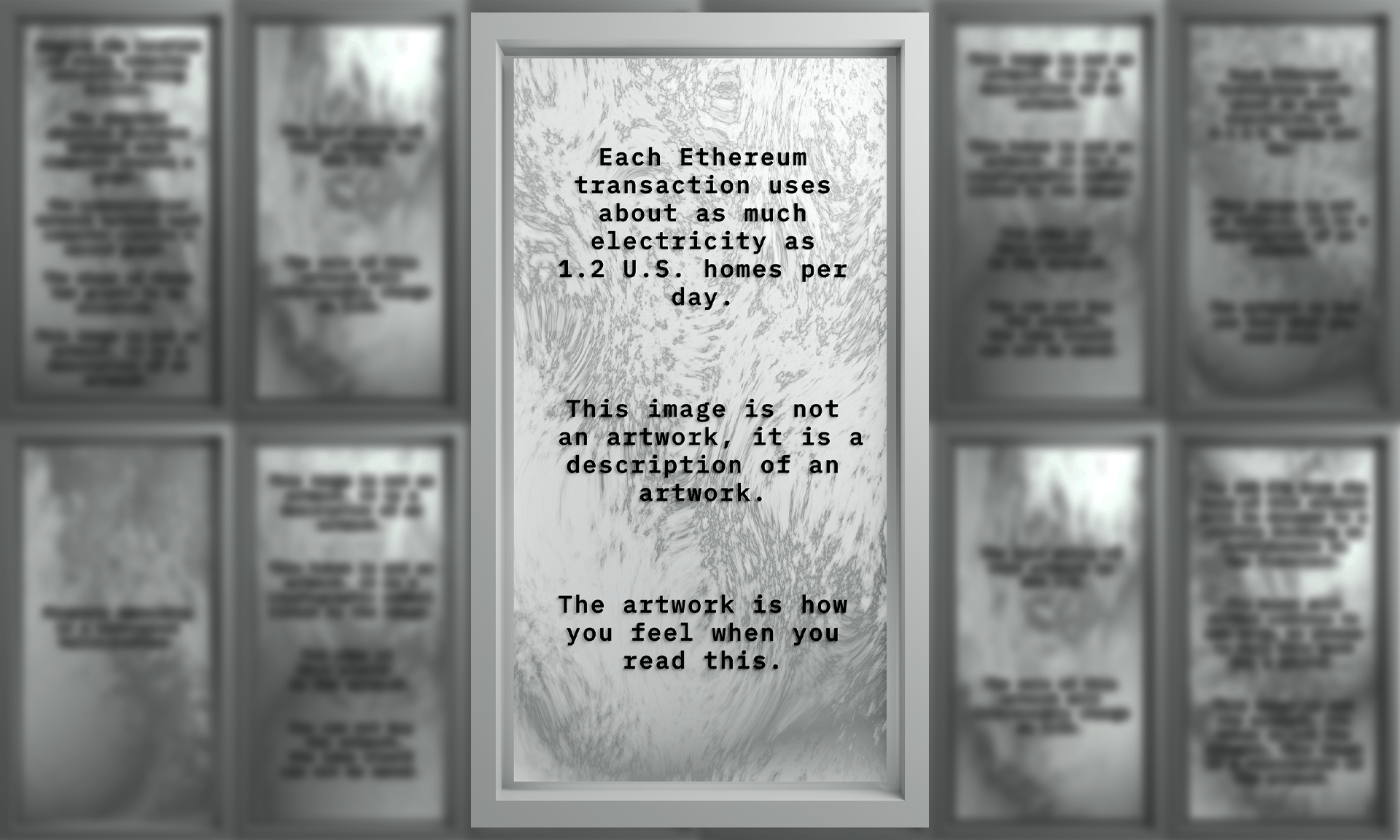 ““Each Ethereum transaction uses about as much electricity as 1.2 U.S. homes per day. / This image is not an artwork, it is a description of an artwork. / The artwork is how you feel when you read this.””