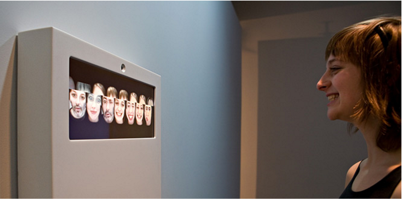 Her work is akin to that of Tmema’s Reface, the collaboration team of Golan Levin and Zachary Lieberman, in that they are both spaces created to allow for interactivity between humans. Reface is a portrait sequencer that creates video mash-ups of visitors faces. This was inspired the Victorian Parlor game Exquisite Corpse and uses face tracking techniques which allows for automatic segmentation and alignment of the various faces, this allows visitors to move freely around the camera without worry of throwing off the camera with unalignment. The video clips are edited by the participants blinking, a blink triggering each new set of face combinations. The two works though very different in form and structure both aim to show that we are constantly connecting to others, stranger and familiar face alike. That we converge and don’t even realize it. Click here to view Tmema’s documentation of Reface.