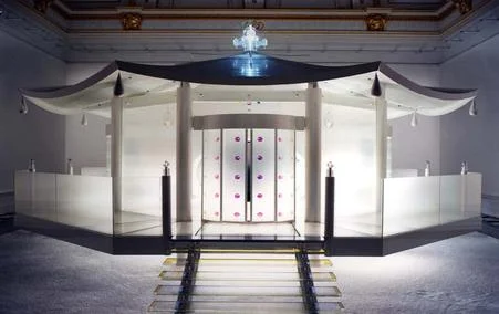 This is not Mori’s first attempts at creating modern interactive spaces to interpret ancient Buddhist principles and methodologies. For example her 1999 piece, Dream Temple. Dream Temple is also a structural creation used to invoke a spiritual experience. The structure pays homage to Japan’s oldest Buddhist Temple, Yumedono. One enters the interpretation of the temple to meditate, they reach a chamber in the depths of the structure and stream spacey electronic music through headphones. They meditate before a concave screen, that Mariko Mori animates with 4 minutes with of abstract cosmic imagery. Much like the Wave UFO, Mori’s Dream Temple is an incredibly personalized experience. Entrance is by appointment only and one can only enter alone. Both works utilize modern technologies to invoke Buddhist teachings, Dream Temple using electronic music and animated projections to guide one through a Buddhist meditation. The only major difference is Dream Temple structurally conjures a Buddhist sensationalism, while Wave UFO architecturally brings about a galactic feel.