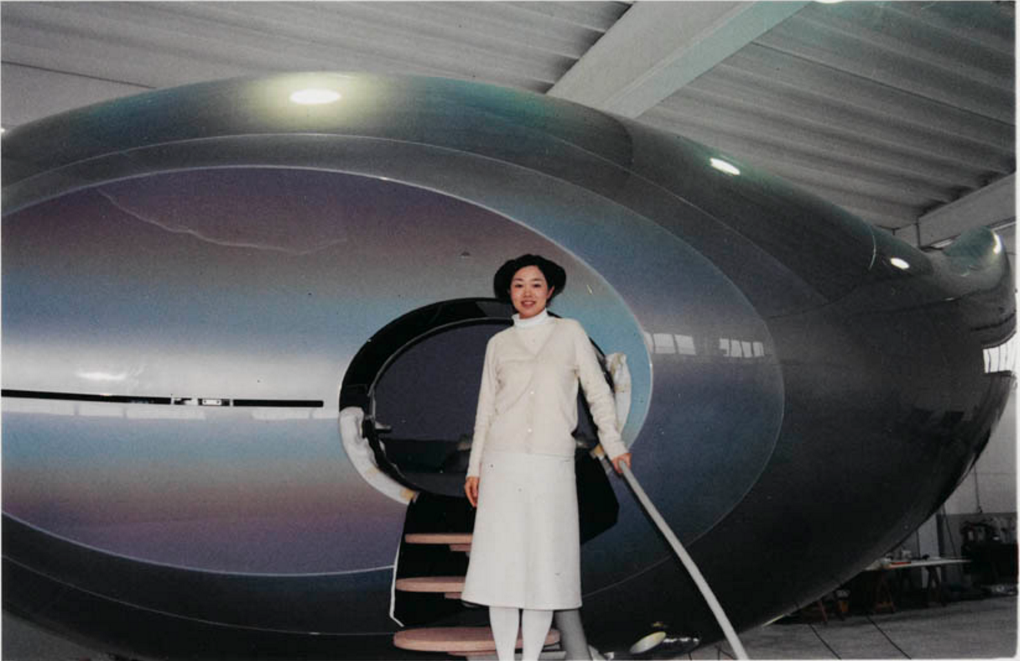 Wave UFO is a large-architectural sculpture that took Mori over three years to produce. She found a great deal of inspiration from her research of the automobile factories in Turin, Italy. Featured as a stand-alone piece, the metallic work took up a whole room and was toured extensively across the globe. The fiberglass, droplet-esque structure stands 14-feet tall, 17-feet wide, and 34-feet long. To reach the inner sanctum of the three dimensional Wave UFO , one must traverse the lilypad staircase and through the clear, electronic bubble door. While the architectural vessel itself is remarkably impressive, it is through this entryway that the astounding interactivity occurs.